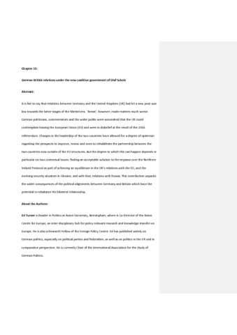 Turner, Ed and Rowe, Carolyn (2023). The 2021 Federal Election, the New Coalition Government of Olaf Scholz, and British/German Relations. IN: The 2021 German Federal Election. Campbell, Ross and Davidson-Schmich, Louise K. (eds) New Perspectives in German Political Studies . Springer.