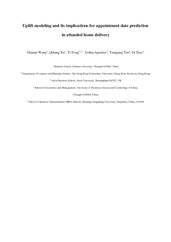 Wang, Dujuan, Xu, Qihang, Feng, Yi, Ignatius, Joshua, Yin, Yunqiang and Xiao, Di (2024). Uplift modeling and its implications for appointment date prediction in attended home delivery. Decision Support Systems, 185 ,