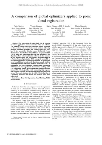 Barrios, Pablo, Guzman, Vicente, Adams, Martin and Rudorfer, Martin (2024). A comparison of global optimizers applied to point cloud registration. IN: Conference Proceedings of the 13th International Conference on Control, Automation and Information Sciences (ICCAIS). Proceedings of the International Conference on Control, Automation and Information Sciences (ICCAIS) . IEEE.